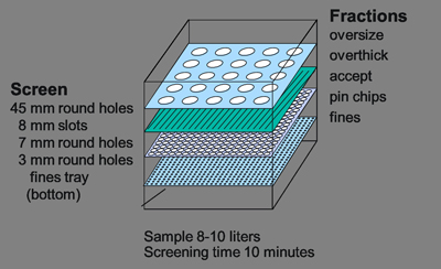 木片质量是根据一些定义的标准来衡量的。 纸浆、造纸中最著名的是标准 SCAN-CM 40:94。 在这种方法中,木片样本通过不同的电线,因此特定部分按重量分类。