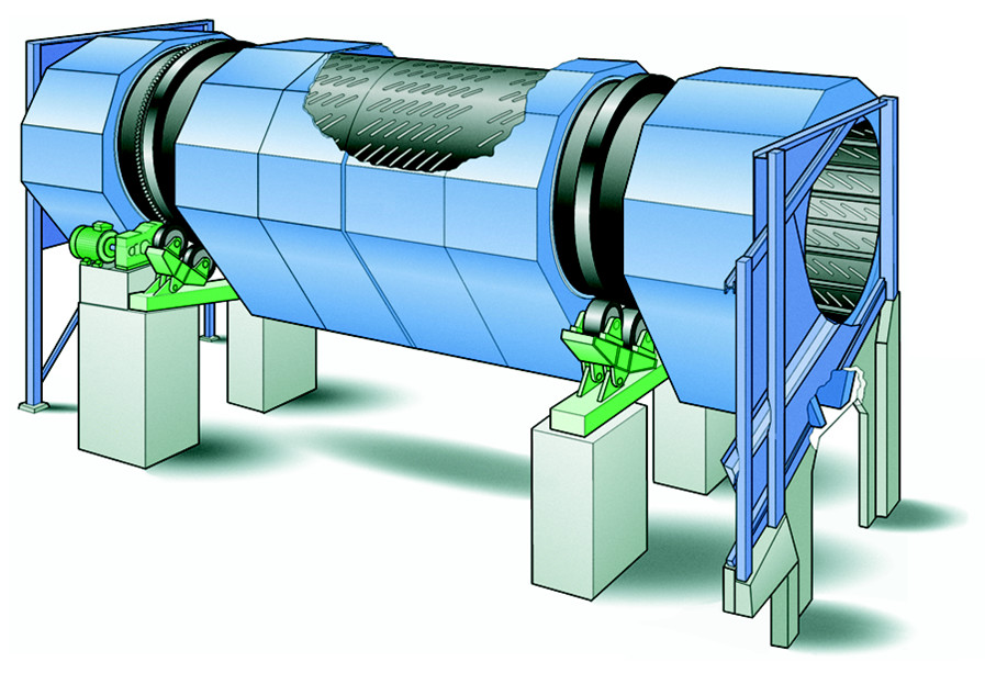 用于原木剥皮的设备是剥皮滚筒。 在滚筒中,原木升降机使原木床保持连续运动。 大多数剥皮过程是通过原木之间的相互作用进行的。 树皮槽允许将树皮、沙子和石块从滚筒中清除。 滚筒在钢轮橡胶上旋转。 转鼓出口有一个闸门,控制流量和停留时间。