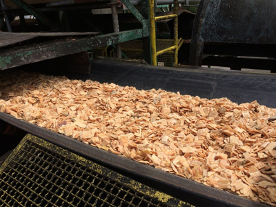 传送带上有金属探测器,还有石头陷阱。目的是保护削片机免受大而硬的污染物的影响。在削片机处,原木被切成小尺寸。之后,可以筛选或存储木片。在筛选站,木片被分类,只有接受物会被转发到下一个生产区域。
